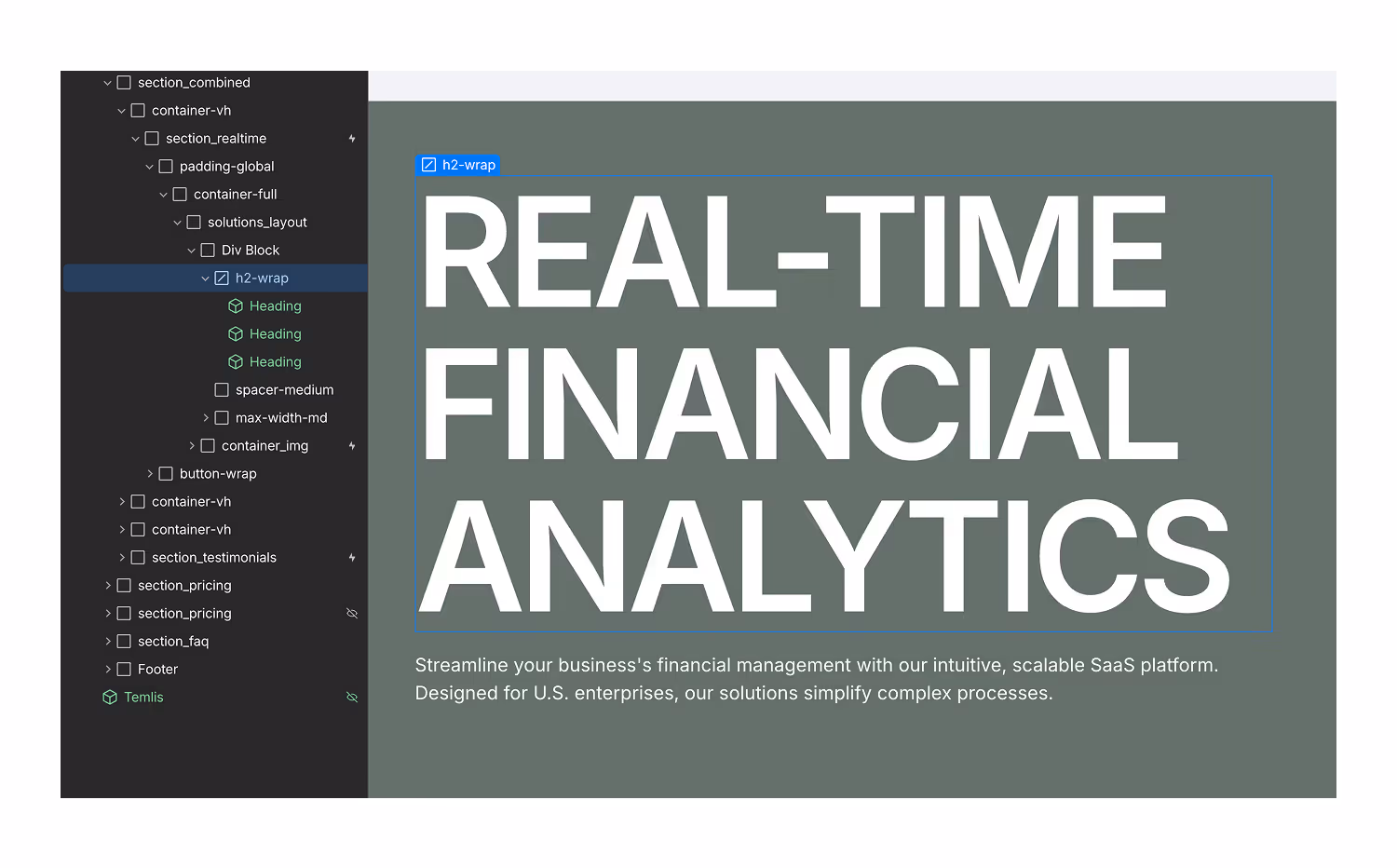In other sections (like REAL-TIME FINANCIAL ANALYTICS), the heading animation is different — it uses only one animation that triggers as you scroll.You don’t need to adjust any delays here.Just select the Heading Component and replace the text as shown in the example.